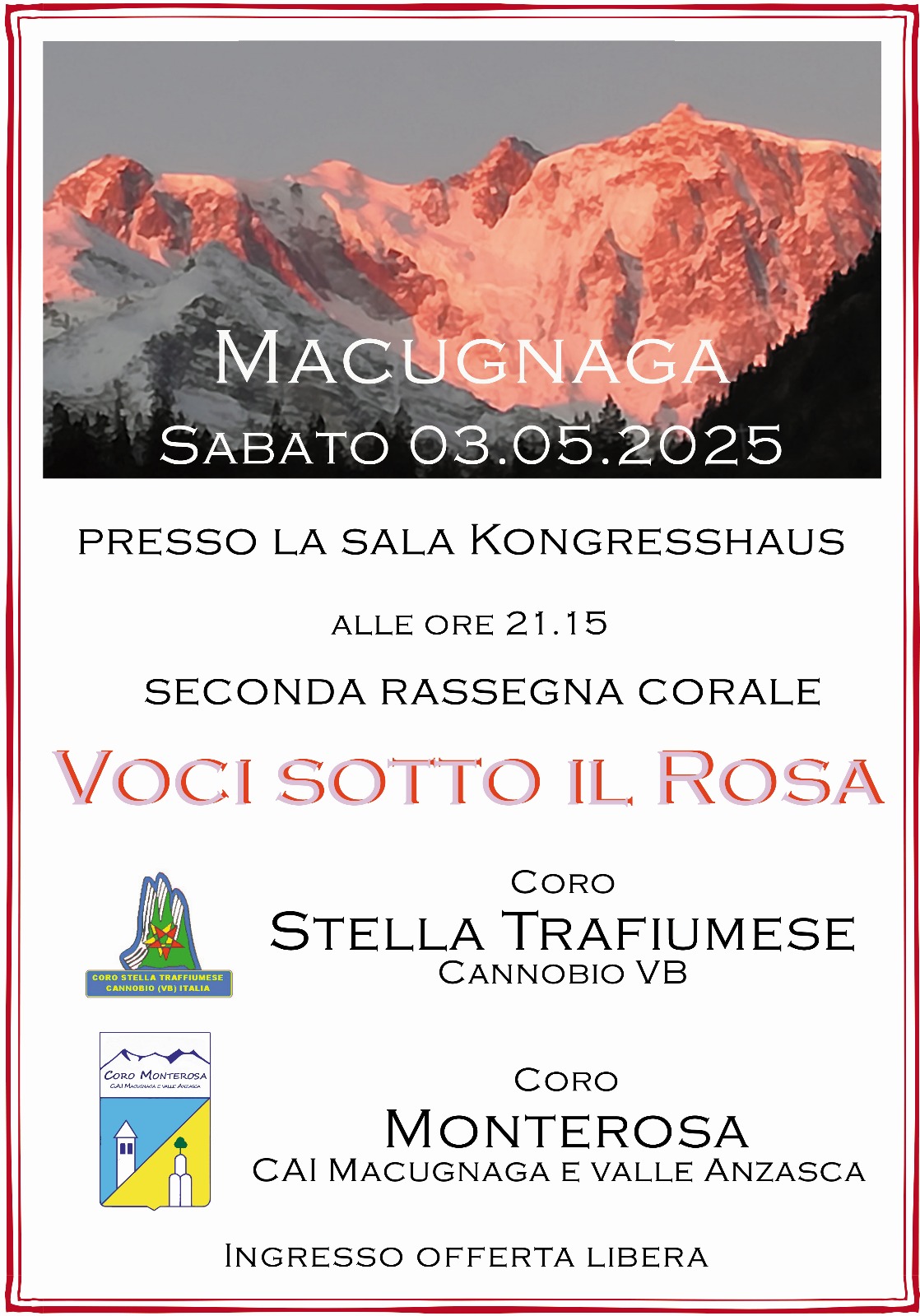 Sabato 3 maggio 2025 alle ore 21,15 presso la Kongresshaus si terrà la 2° rassegna corale "Voci sotto il Rosa" come da programma allegato.